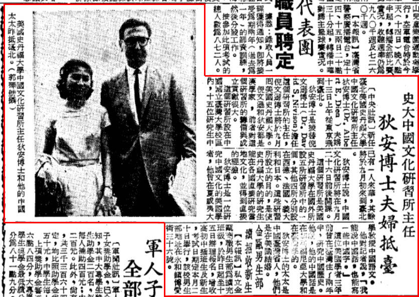 Dr. Dien is taking up Dr. David S. Nivison's post as D of the Research Center. Dr. Nivison will return to Stanford University in September. Nivison and Dien are both sinologists. The former has contributed significantly in the preparatory stages of the center. This research center is located on the National Taiwan University campus. One of the fifteen expected students has already arrived in Free China, while the remaining students will come to Taipei in the beginning of September.