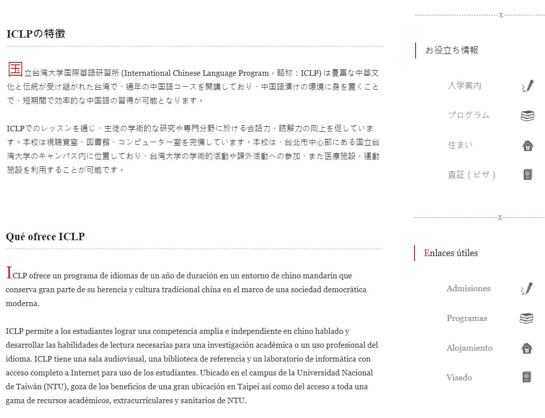中国語版と英語版に記載されている情報の一部がスペイン語版と日本語版にもございますので、スペイン語または日本語が母語の中国語学習者に紹介していただければ嬉しく思います。より多くの外国の方々がICLPで勉強することを期待しています!