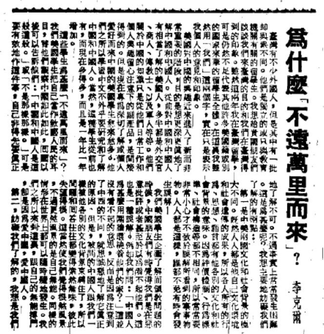 臺灣有不少外國人,但是其中有一批却與眾不同。他們是獨立的或只與教育機關有關的留學生。我想給貴國朋友們談談我們來臺灣的目的和我們在臺灣得到的印象。雖然這兩年我在臺灣留學,可是仍然不足代表其他許多美國籍或別的國家來華的留學生全體。在這裏我雖然用「我們」這兩個字,實在只是表示我個人的意見和印象。