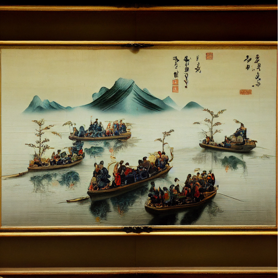 (圖片解釋:這張圖片乍看之下看似像中國古代道地的一幅畫。但是,仔細一瞧,你會發現裡面有些蹊蹺,比方說,上面的「漢字」不太對勁。其實,這幅畫是用文字轉圖片的人工智慧軟體製作的,是輸入「一幅元朝的畫,裡面有船在河中沉沒」這句話所產生的結果。這樣做是為了避免版權上的問題。)