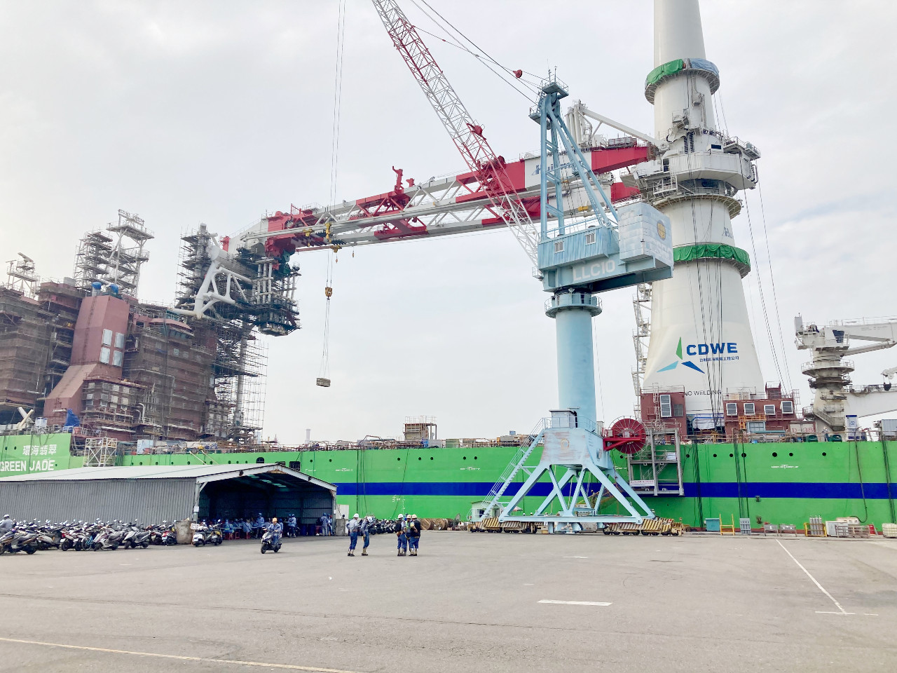 這艘船正在台船的港口進行最後幾個月的裝備,到處都有戴著安全帽的員工做焊接工作。我上月跟著一團台船工程師,還有兩位當天早上剛飛來的荷蘭工程師,一起從甲板爬到起重機上。能看到這艘獨一無二的主力風電工作船是難得的經驗,因為這不僅僅是一艘船,它代表的是台灣再生能源的未來。