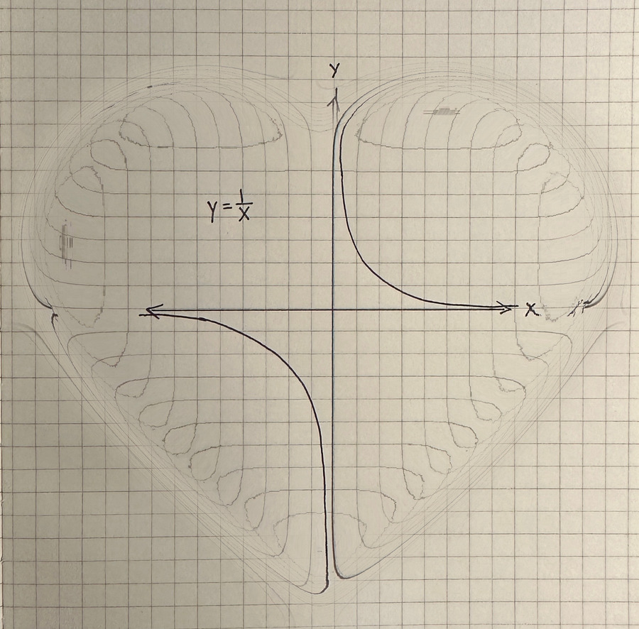 我認為幾何中最浪漫的函數是 y = 1/x。它畫出來的圖像是兩個對稱的、被困在第一與第三象限的弧形。右上弧形像笑臉、逐步步向永恆而增長。左下弧形像哭臉、只能墜入負數之無限深淵。他們倆像是一對永遠碰不到彼此的情人,之間夾著 x=0 與 y=0 的十字架,形成了兩條漸近線,像隔離著一對情人的障壁。但上弧形與下弧形不斷地試著接近、觸碰、越過那些分隔他們的直線、直到你手中的圓珠筆畫到紙頭的邊緣。
