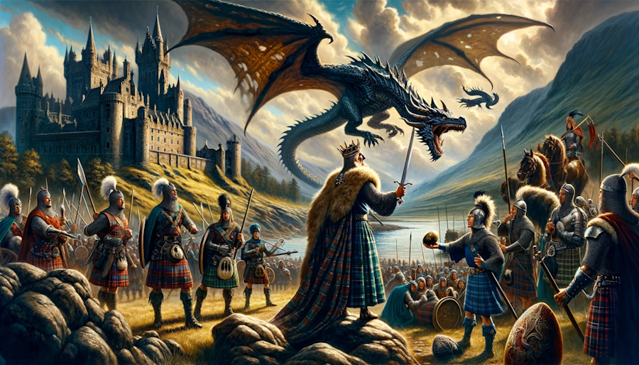 可是這個聚落其實是古老的蘇格蘭王國,在這個時代蘇格蘭的國王有一個很厲害的軍隊。他們已經提前準備好對抗這隻龍了。蘇格蘭的國王決定以自己為領導人帶他的軍隊去保衛國家。蘇格蘭和龍的戰爭持續了五天,國王拒絕退兵。不管有幾個人會被殺死,他都一定要繼續對抗。五天後,國王失去了半個軍隊,可是總算打敗龍了。表面上國王說他們沒偷龍的蛋,跟龍打仗只是要保衛他的國家而已,可是實際上是國王偷了這個蛋。